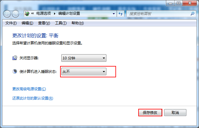 2、選擇“使計(jì)算機(jī)進(jìn)入睡眠狀態(tài)”,我們可以根據(jù)自己的需求來(lái)進(jìn)行選擇適當(dāng)?shù)臅r(shí)間,也可以選擇“從不”,點(diǎn)擊“保存修改”按鈕,這樣電腦就不會(huì)進(jìn)入睡眠狀態(tài),就可以一直在線工作了。