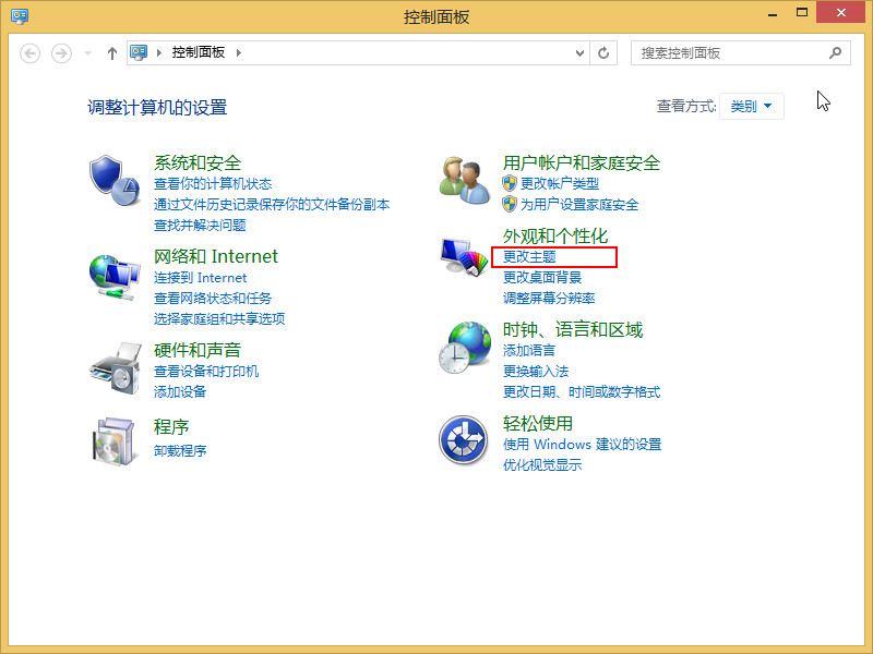 2、打開控制面板后,點(diǎn)擊外觀和個(gè)性化下方“更改主題”,如下圖所示: