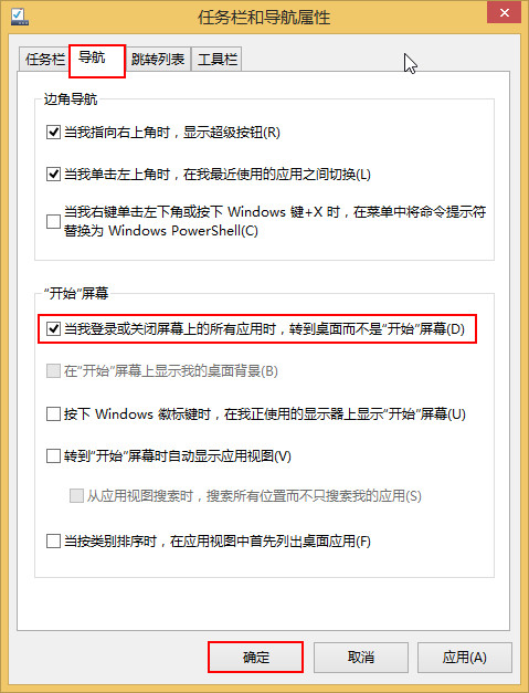 4、點(diǎn)選任務(wù)欄和導(dǎo)航屬性中“導(dǎo)航”頁面,然后勾選“當(dāng)我登錄或關(guān)閉屏幕上的所有應(yīng)用時(shí),轉(zhuǎn)到桌面而不是“開始”屏幕”,按下“確定”,如下圖所示: