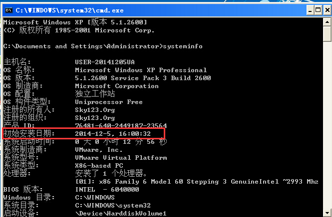 1、查看windows xp初安裝時(shí)間的方法。我們依次點(diǎn)擊開始--運(yùn)行,輸入cmd,回車確定,在命令窗口輸入systeminfo,此時(shí)就會(huì)顯示xp系統(tǒng)的安裝時(shí)間,這就是它的“生日”了,如果后期使用Ghost版本的系統(tǒng)重裝過了,上述方法查詢依舊可以顯示此前初安裝的日期。