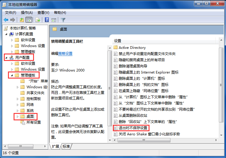 2、在本地策略組編輯器中,依次展開“用戶配置--管理模板--桌面”,在右側(cè)界面中找到并打開“退出時不保存設(shè)置”選項,如圖所示: