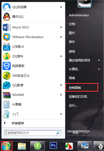 2、鼠標點擊“開始--控制面板”,如圖所示: