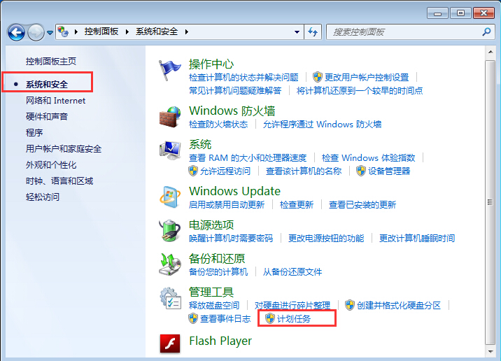 3、在控制面板中找到“系統(tǒng)與安全”,在管理工具中打開“計劃任務”,如圖所示: