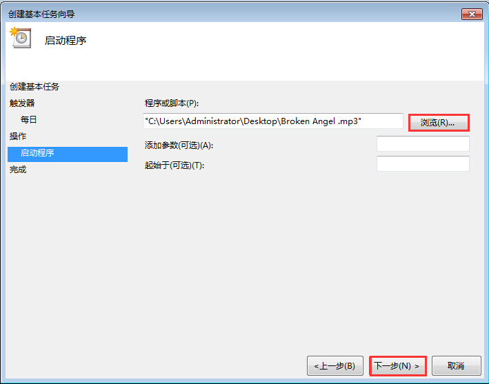 6、在“啟動程序”界面,點擊“瀏覽”選擇剛才我們預備的歌曲,如圖所示: