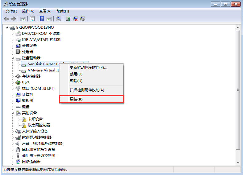 3、在設(shè)備管理器界面中找到并點擊“磁盤驅(qū)動器”,此時可以看到自己U盤的選項,在上面右鍵單擊,選擇“屬性”,如圖所示: