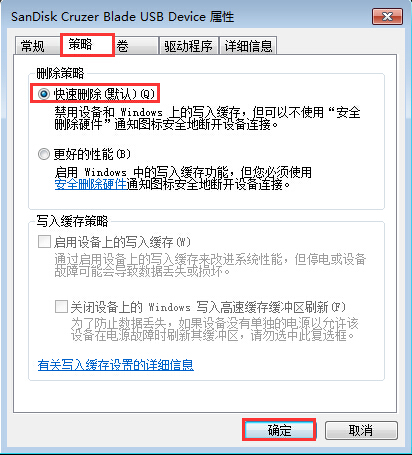4、在屬性界面中,點擊“策略”,然后點選“快速刪除”,然后點擊下方的“確定”,如圖所示: