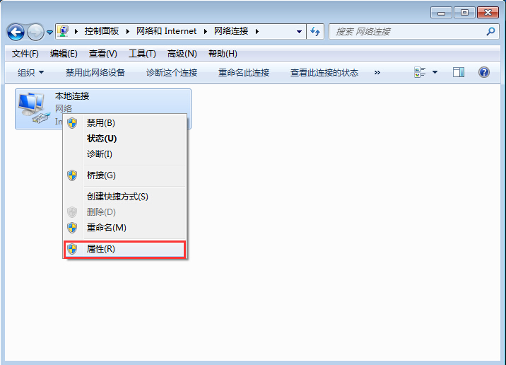 2、在網(wǎng)絡(luò)連接的界面,找到當(dāng)前所使用的網(wǎng)絡(luò),右鍵選擇“屬性”,如圖所示: