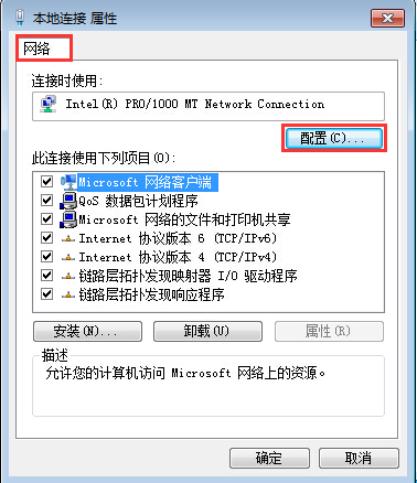 3、在屬性窗口點(diǎn)擊“網(wǎng)絡(luò)--配置”,如圖所示: