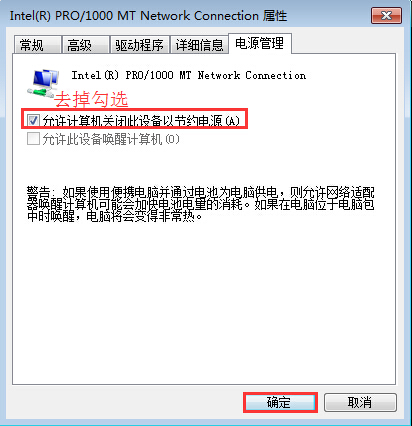 4、在新窗口中點(diǎn)擊“電源管理”,在下方將“允許計(jì)算機(jī)關(guān)閉此設(shè)備以節(jié)約電源”前面的勾去掉,然后點(diǎn)擊確定即可,如圖所示: