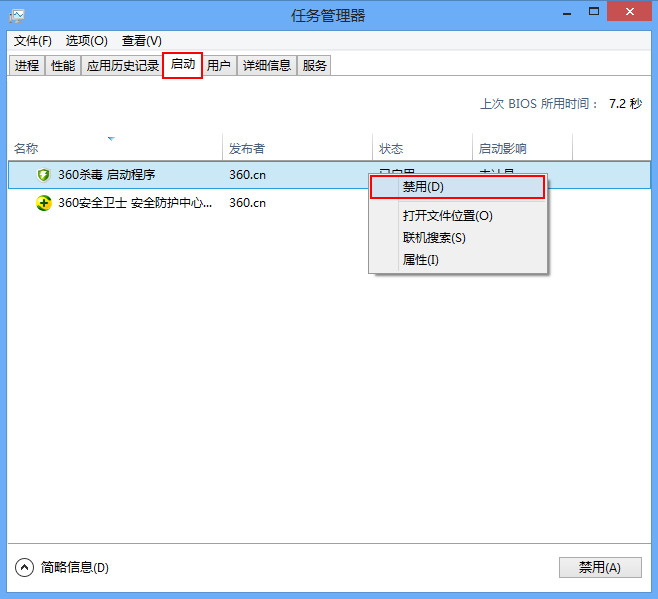 3、打開任務管理器中“啟動”界面,右鍵單擊不需要啟動的選項,然后選擇“禁用”屬性,如下圖所示: