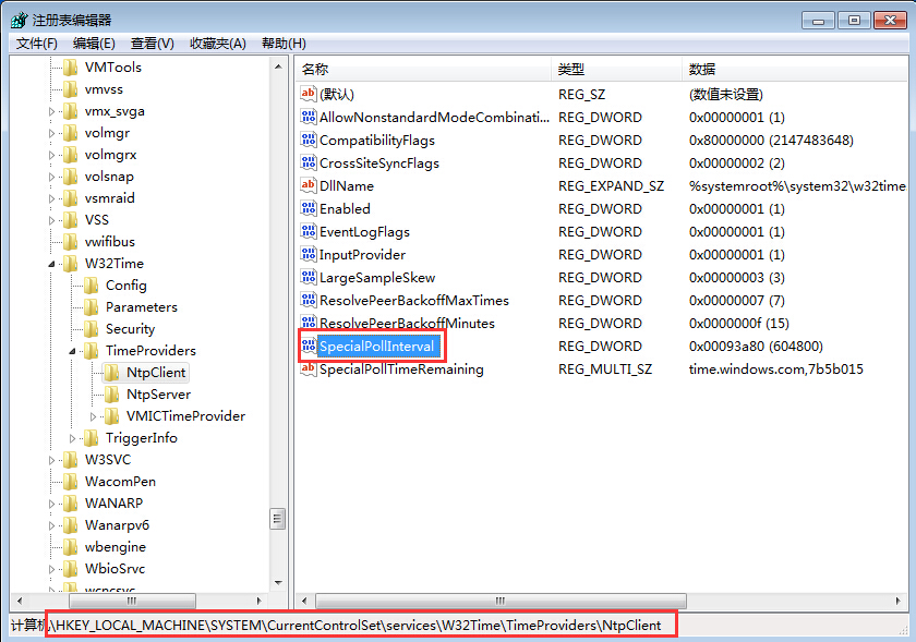 2、在注冊(cè)表編輯器中展開(kāi)“HKEY_LOCAL_MACHINE\SYSTEM\CurrentControlSet\Services\W32Time\TimeProviders\NtpClient”,在右側(cè)列表中找到SpecialPollInterval,如圖所示: