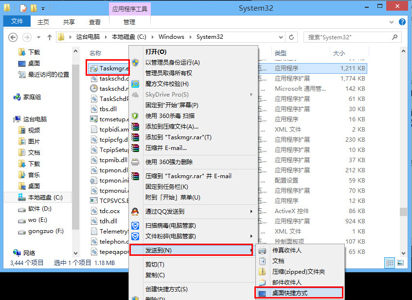 2、在taskmgr.exe文件上右鍵,選擇“發(fā)送到--桌面快捷方式”,如圖所示: