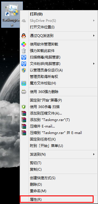3、此時返回桌面,看到新建的taskmgr.exe快捷方式,右鍵選擇“屬性”,如圖所示: