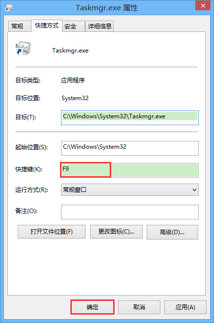 4、在彈出的窗口中,在“快捷方式”下面找到“快捷鍵”,設置自己想要的快捷鍵,然后點擊“確定”,這樣只要按下快捷鍵就可以啟動任務管理器了。