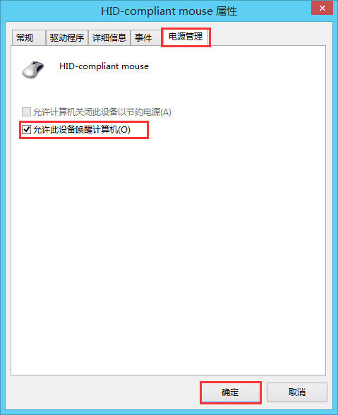 4、在彈出的窗口中點(diǎn)擊“電源管理”選項(xiàng)卡,在下方勾選“允許此設(shè)備喚醒計(jì)算機(jī)”,最后點(diǎn)擊下方的“確定”按鈕,如圖所示: