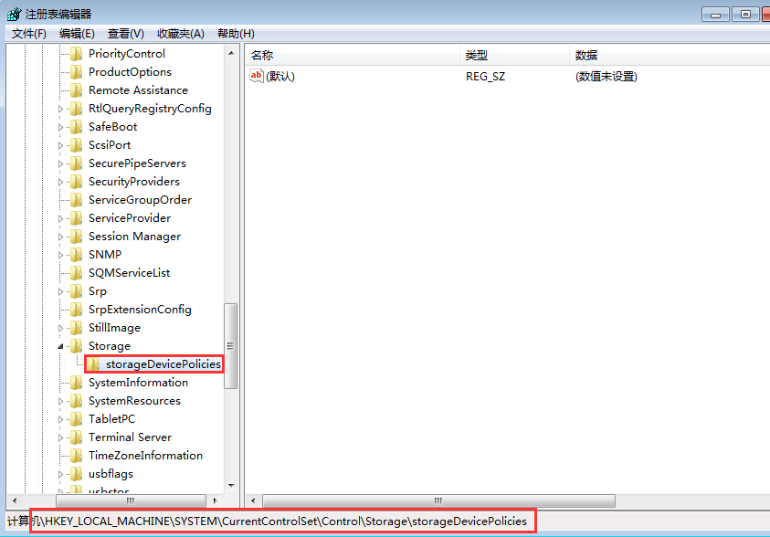 2、在注冊表編輯器中,依次展開HKEY_LOCAL_MACHINE--SYSTEM--currentControlSet--Control--Storage-storageDevicePolicies,如果沒有最后一項,則自己新建即可,如圖所示: