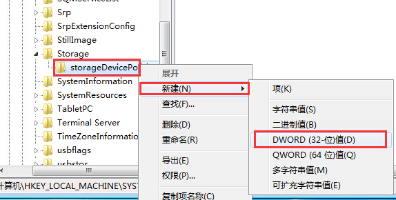3、在storageDevicePolicies上右鍵點擊,新建dword值,如圖所示: