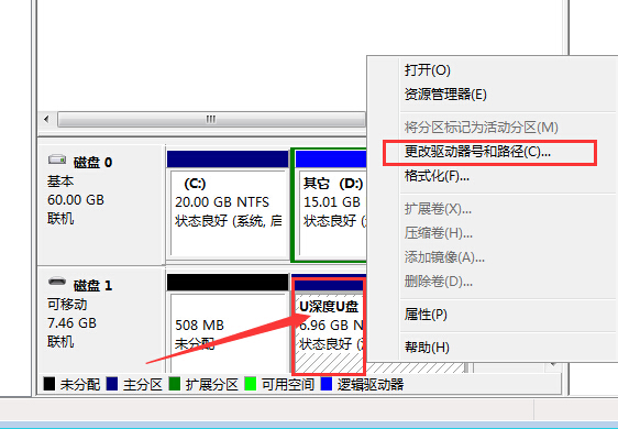 3、點(diǎn)擊我們的U盤部分,右鍵選擇“更改驅(qū)動(dòng)器號(hào)和路徑”,如圖所示: