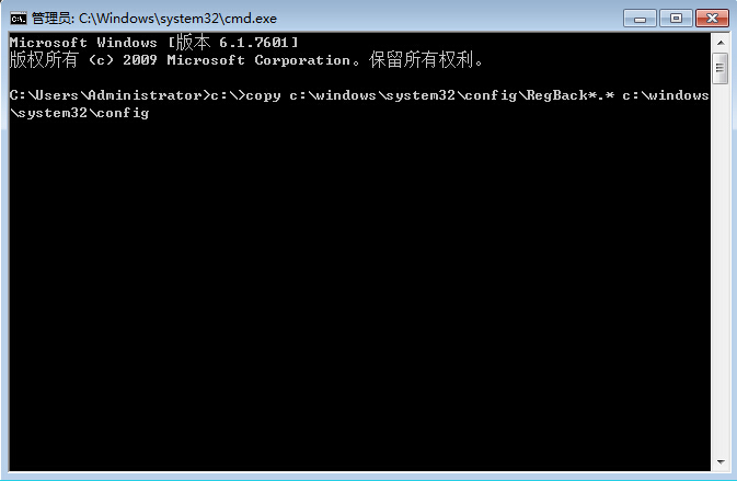 2、在命令窗口輸入c:\>copy c:\windows\system32\config\RegBack*.* c:\windows\system32\config,按回車(chē)鍵確定,如圖所示: