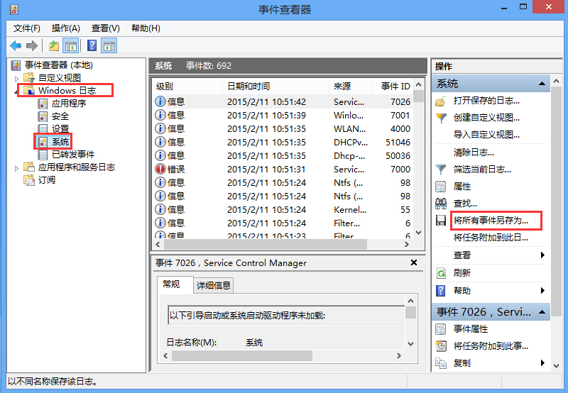 2、在事件查看器界面中,點(diǎn)擊左側(cè)的“windows日志--系統(tǒng)”,然后在右側(cè)的列表中找到“將所有事件另存為”,如圖所示: