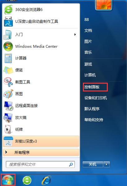 1、我們首先打開開始菜單,選擇控制面板,如圖所示:
