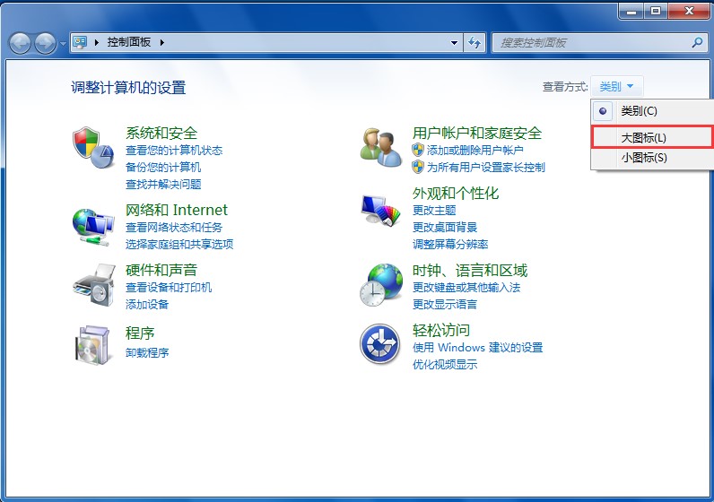 2、進(jìn)入控制面板后切換查看方式為“大圖標(biāo)”,如圖所示: