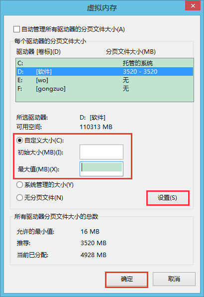 6、點(diǎn)擊“自定義大小”,然后在方框中填入虛擬內(nèi)存的大小,如果不清楚具體應(yīng)該填多少可以看下方有個(gè)推薦的數(shù)值,按照推薦進(jìn)行填寫(xiě)即可,另外為了不讓虛擬內(nèi)存一直處于波動(dòng)中,我們也可以將初始大小和最大值都設(shè)置成推薦的數(shù)值,填完后記得先點(diǎn)擊“設(shè)置”,然后再點(diǎn)擊“確定”,如圖所示: