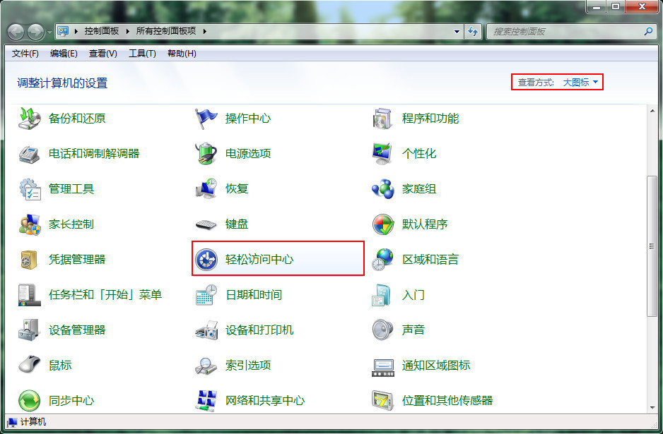 2、進入控制面板后,先將查看方式更改成“大圖標”,然后找到“輕松訪問中心”選項,如下圖所示: