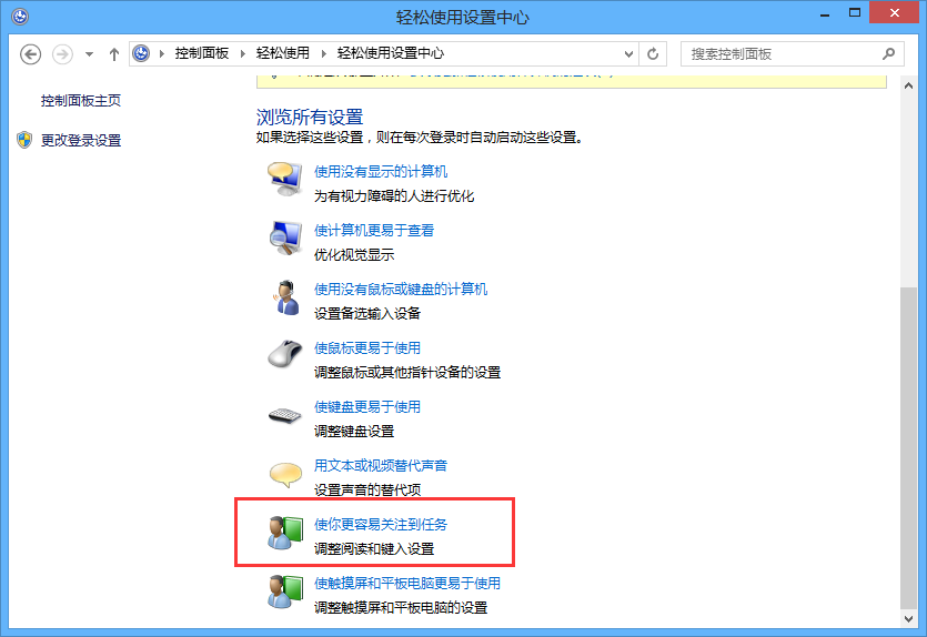 進入控制面板后,點擊“輕松使用--輕松使用設(shè)置中心”,如圖所示: